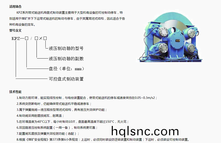 KPZ係列製動器主要用于下(xia)運帶式輸送機或大傾角上運式輸送機等大型機電設備的可控製動與停車(che),